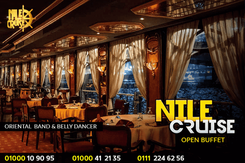 الباخرة نايل كروز الملكية Nile Cruise  نايل كروز ذات فئة الـ 5 نجوم و التى تعد من افضل البواخر النيلية المتحركة بالقاهرة حيث تشمل الرحلة النيلية الإبحار فى النيل مع افضل الفقرات الفنية الرائعة بجانب تناول أشهى المأكولات الشرقية و الغربية